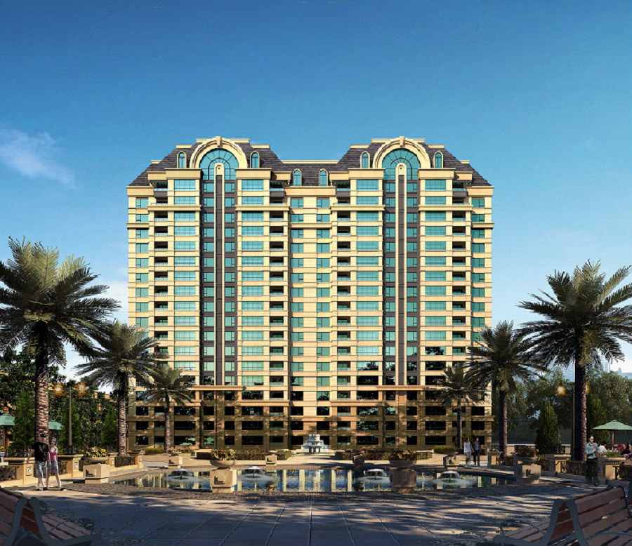 立面特点三段式的处理,营造稳重庄严的气势。整体采用米黄色石材,提升建筑品质感,立面上体现经典的法式元素,如柱式、拱券、老虎窗等,同时穿插玻璃材质,充分体现小区整体品质。